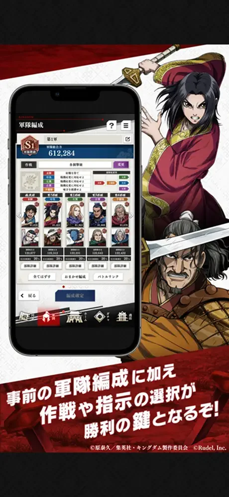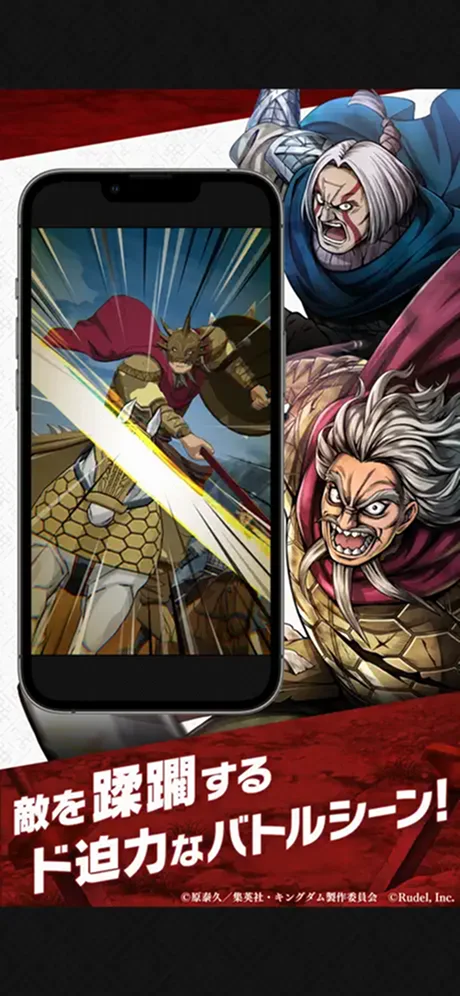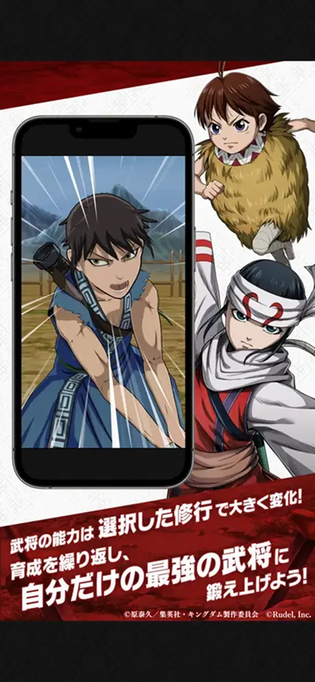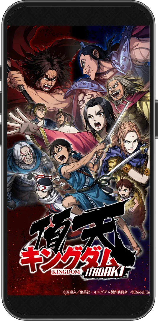 キングダムのオリジナルソーシャルゲームとなる、育成シミュレーションゲームです。主人公は練兵家となり「キングダム」に登場する武将たちを獲得、育成し、育成した武将たちを率いて最強の軍隊を編成、並み居る強敵を討ち倒し中華の「頂天」を目指します。